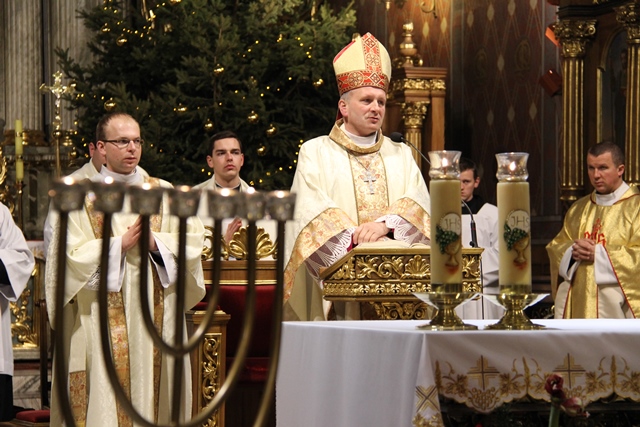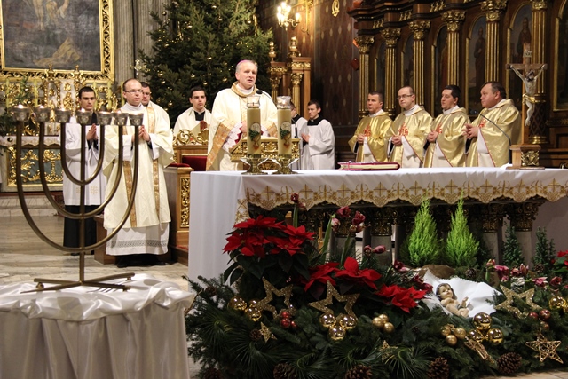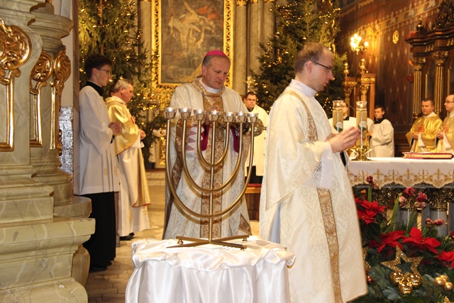 W homilii dyrektor Radia Rodzina Diecezji Kaliskiej przekonywał, że ukoić ból człowieka może tylko Jezus. – Jezus jest odpowiedzią na cierpienie narodu wybranego. On jest odpowiedzią dla Jeremiasza i dla każdego z nas. Tylko Jezus. Bez Niego nie da się wyjaśnić nic – mówił ks. Łukasz Skoracki. Wskazywał, że Jezus zwyciężył przez krzyż. – Jezus zawsze staje w naszym życiu jako Ten, który pokonał śmierć, jako Ten, który jest zwycięzcą, jako Ten, który mówi, że demon umarł, że nie ma śmierci. Jezus pokonał śmierć nie tylko swoją, ale pokonał śmierć każdego z nas, a to oznacza, że niczego nie musimy się lękać, bo nie ma śmierci, jedyną śmiercią jest grzech – powiedział kaznodzieja. Podkreślał, że Jezus chce jedności, dlatego w Dzień Judaizmu ma wybrzmiewać modlitwa o dialog i jedność. - Jezus prosił „módlcie się, abyście byli jedno”. Nie da się w tym dniu mówić o Biblii, o Piśmie Świętym, o historii bez Jezusa. Jezus mówił „módlcie się za siebie”. Kiedy w nas zacznie żyć Jezus i kiedy my zaczniemy żyć Jego życiem to jest szansa, że ci, za których modlimy się dzisiaj spotkają Mesjasza, który już przyszedł, który jest życiem i który jest jedyną odpowiedzią na Auschwitz, krematoria, wszystkie prześladowania, każde cierpienie. Tylko Jezus jest odpowiedzią – stwierdził ks. Skoracki. Biskup pomocniczy diecezji kaliskiej podziękował wszystkim za udział w liturgii sprawowanej w intencji wyznawców judaizmu i chrześcijan. – Dzień Judaizmu jest nawiązaniem do jednej z deklaracji Soboru Watykańskiego II, która traktowała o relacji Kościoła Katolickiego do innych religii, a spośród tych religii szczególne miejsce zajmuje judaizm, bo to jest wnętrze naszej religii. Ciągle sięgamy do Starego Testamentu po to, aby w innym świetle spojrzeć na Nowy Testament – powiedział bp Łukasz Buzun. Wraz z biskupem Mszę św. koncelebrowali: ks. prałat Andrzej Latoń, wikariusz generalny diecezji kaliskiej, ks. prałat Adam Modliński, proboszcz katedry, ks. Piotr Górski, rektor Wyższego Seminarium Duchownego w Kaliszu, ks. Łukasz Pondel, ojciec duchowny seminarium, ks. kanonik Eugeniusz Synowiec, dyrektor administracyjny seminarium, ks. Rafał Kopis, ekonom diecezjalny, ks. Łukasz Skoracki, dyrektor Radia Rodzina Diecezji Kaliskiej, ks. Tomasz Jakubowski, redaktor radia i wikariusz katedry. W modlitwę włączyli się także alumni, wspólnota neokatechumenalna, schola seminaryjna i wierni.