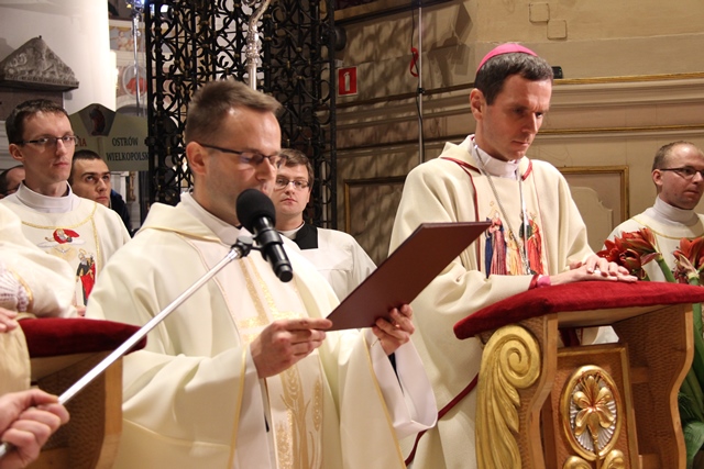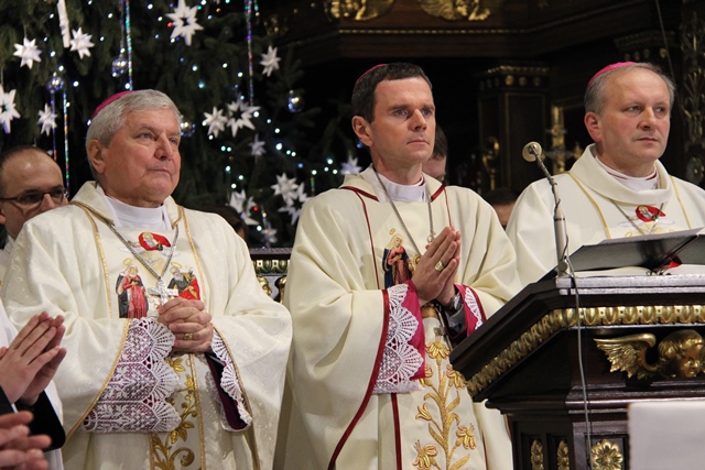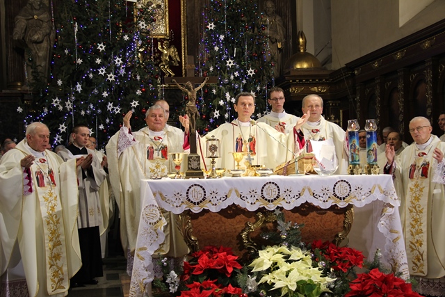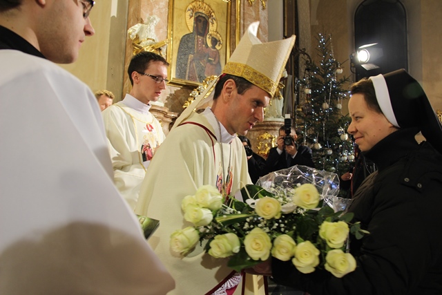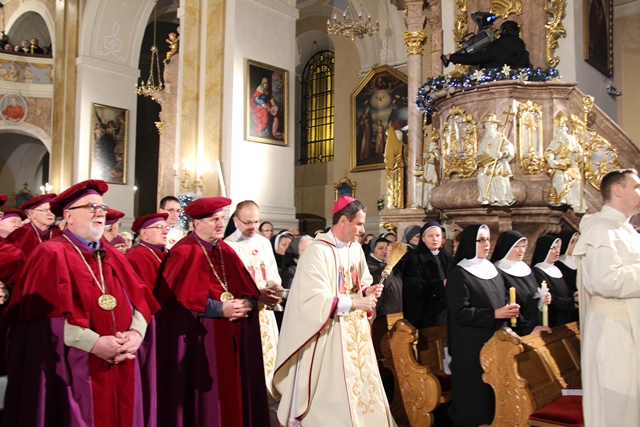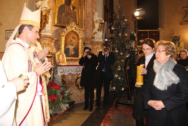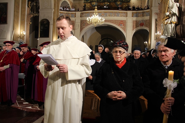 Mszy św. przewodniczył bp Mirosław Milewski, biskup pomocniczy diecezji płockiej. Wraz z nim modlili się: biskup kaliski Edward Janiak, biskup pomocniczy Łukasz Buzun, bp senior Stanisław Napierała, bp senior Teofil Wilski, o. Tadeusz Rydzyk, kilkudziesięciu kapłanów, wierni z diecezji kaliskiej, a szczególnie dekanatów kaliskiego pierwszego, ostrowskiego pierwszego i opatóweckiego oraz osoby konsekrowane z diecezji kaliskiej i pielgrzymi z całej Polski. W homilii bp Milewski dziękował osobom konsekrowanym za gorliwą służbę w Kościele. - Dziś dziękujemy tym zastępom Waszych współbraci i Was za świadectwo życia zakonnego. Nie byłoby roku 1918, ale też nie byłoby roku 1989, gdyby nie Wasza mrówcza, mozolna, ukryta, a nierzadko szykanowana przez władze PRL praca u podstaw, z najbardziej tego potrzebującymi. W dzieło misji prorockiej wpisały się przez wiele wieków dziesiątki tysięcy zakonników, idących z posługą słowa. Od pierwszych benedyktynów, którzy przynieśli tak wielu z naszych przodków chrzest, przez franciszkanów i dominikanów, tłumaczących zawiłości wiary, jezuitów i redemptorystów – mistrzów słowa i jego przekazu, aż po salezjanów, pracujących cierpliwie z młodzieżą – podkreślał hierarcha. Wskazywał też na rolę, jaką w Polsce odgrywają media katolickie, szczególnie Radio Maryja i Telewizja Trwam. - O ile trudniej byłoby dzisiaj w Polsce mówić o Bogu i Jego Kościele, gdyby nie wkład tych właśnie mediów w tak bardzo zróżnicowany polski rynek radiowo-telewizyjny. O ile trudniej żyłoby się milionom Polaków, starszych i młodszych, pracujących i emerytów, gdyby nie wspólna modlitwa na tych antenach, katechezy, dyskusje, rozmowy niedokończone. O ile trudniej byłoby zrozumieć polską rzeczywistość, gdyby nie te – czasami bardzo wyraźne – znaki sprzeciwu – powiedział biskup pomocniczy diecezji płockiej. Zachęcał wiernych, aby prosili Boga o światło dla siebie i swoich najbliższych. - Z gromnicami w ręku, jak nasi ojcowie, przychodzimy w to dzisiejsze święto, aby prosić Boga o światło. Potrzebują tego światła nasze rodziny, tak bardzo zranione różnymi bolesnymi sytuacjami: brakiem dzieci, chorobami, rozwodami, zazdrością. Potrzebują go nasze szkoły, zwłaszcza katolickie, w dobie reorganizacji, by były miejscem wychowania i zdobywania wiedzy – zaznaczył celebrans. Prosił też o światło dla wspólnot diecezjalnych, parafialnych i lokalnych. - Potrzebują tego światła nasze parafie i diecezje, a zwłaszcza seminaria duchowne i nowicjaty zakonne, gdzie czasem płomień zapału przygasa i woła o nowych, młodych, którzy wezmą do ręki tę pochodnię Kościoła. Potrzebują tego światła nasze lokalne wspólnoty, nasze „małe ojczyzny”, bo czasem nazbyt mocno zapanowały tam ciemności. Potrzebują tego światła katolickie media, by jego blask zadziwiał ludzi i przyciągał do wiary i zaufania Bogu. Potrzebuje tego światła każdy z nas, by „światłość w ciemności świeciła i ciemności jej nie ogarnęły” – mówił bp Milewski.