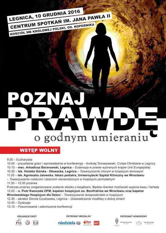 „Poznaj prawdę o godnym umieraniu” – to tytuł kolejnej konferencji naukowej z cyklu „Poznaj prawdę o…” organizowanej przez Duszpasterstwo Rodzin Diecezji Legnickiej, Prawo i Sprawiedliwość w Legnicy oraz Stowarzyszenie Katolickie Civitas Christiana. Konferencja odbędzie się 10 grudnia w Legnicy, w Centrum Spotkań im. Św. Jana Pawła II, przy parafii Matki Bożej Królowej Polski (Pl. Kard. Wyszyńskiego).