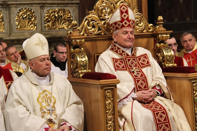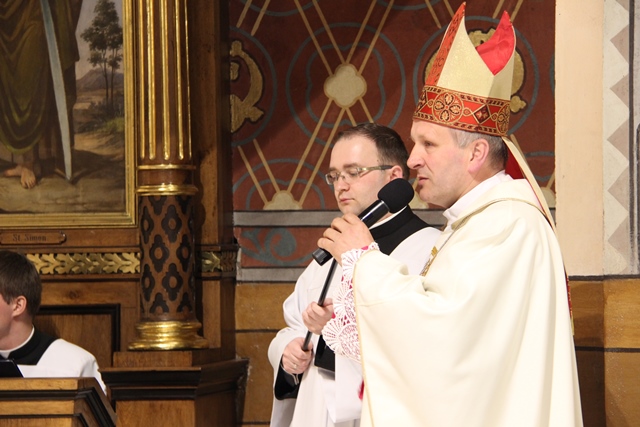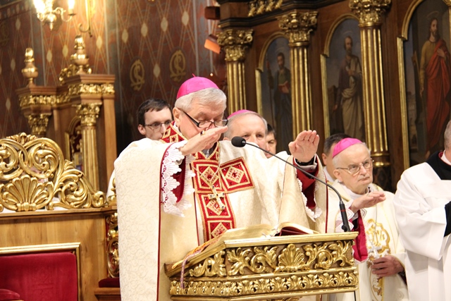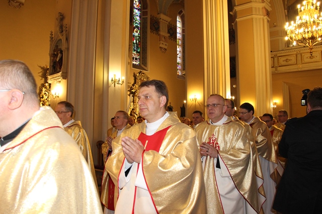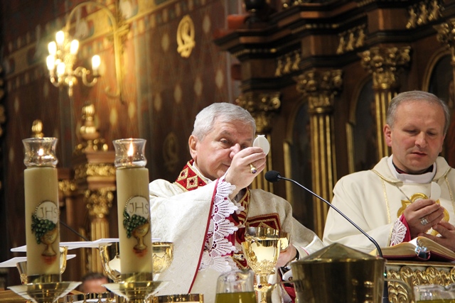 W homilii biskup kaliski zachęcał duchownych do odkrywania na nowo swojego kapłaństwa. – W roku jubileuszowym 25-lecia istnienia diecezji kaliskiej staramy się na nowo odkryć tożsamość kapłańską, aby jeszcze gorliwej pracować w winnicy Pańskiej. Wewnętrzna formacja kapłańska z natury rzeczy nastawiona jest na ciągły rozwój i wzrost – mówił celebrans. Podkreślał, że kapłani poprzez Słowo Boże, sakramenty święte i ewangelizację budują Kościół święty, który jest komunią, a nie organizacją użyteczności publicznej. – Niestety, wielu publicystów wypowiadających się na łamach prasy na temat Kościoła, chciałoby go sprowadzić tylko do jakiejś organizacji charytatywnej lub filantropijnej – powiedział kaznodzieja. Dodał, że akcja charytatywna to tylko jeden z aspektów działalności Kościoła, ważny, ale nie najważniejszy. – Zadaniem Kościoła jest misja zbawienia człowieka i w tę misję musi być wpisane nasze kapłaństwo – stwierdził bp Janiak. Zaznaczył, że współczesny świat jest dotknięty laicyzmem, który eliminuje z życia człowieka obecność Boga, wartości nadprzyrodzone i moralne kryteria oceny postępowania ludzi. – Z drugiej strony mamy do czynienia z fundamentalizmem religijnym, który prześladuje i morduje w imię religii, w imię Boga, co jest niezgodne z elementarnym poczuciem zdrowej religijności. W tę optykę współczesnej cywilizacji i globalizacji wrzucony jest kapłan, aby mimo wszystkich przeszkód głosił Dobrą Nowinę o zbawieniu – wskazywał hierarcha. Prosił wiernych o modlitwę w intencji księży. – Zwracam się do Was, drodzy wierni, abyście swoją modlitwą wspierali swoich duszpasterzy. Przez dobrą i harmonijną współpracę można dokonać wiele szlachetnych dzieł w parafiach, do których należycie. Niech Wasza dyspozycyjność będzie zachętą dla kapłanów, by jeszcze gorliwiej pracowali dla zbawienia dusz – mówił ordynariusz kaliski. Podziękował księżom za posługę w diecezji kaliskiej. – Chciałbym Wam serdecznie podziękować za Waszą pracę dla dobra Kościoła Kaliskiego. Ten Kościół jest Waszą matką, a matkę trzeba kochać i wiernie jej służyć – powiedział bp Janiak. W czasie uroczystej liturgii biskup kaliski poświęcił krzyżmo oraz oleje chorych i katechumenów.
