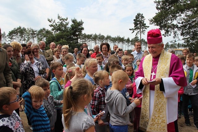Biskup kaliski dziękował leśniczemu za inicjatywę wybudowania kapliczki. – To jest piękny symbol wdzięczności wobec Pana Boga, ale też piękny przykład dla młodego pokolenia. Kościół Kaliski jest młody w swoich strukturach, bo ma dopiero 25 lat. Niedawno dziękowaliśmy Panu Bogu za 20. rocznicę pobytu Jana Pawła II w Kaliszu. To zapisało się mocno w naszej pamięci. Mam też osobiste wspomnienia związane z wizytą papieża w Kaliszu. Pamiętam ten ogromny tłum i to ujmujące przemówienie Ojca Świętego w trosce o rodzinę i dzieci. Takich przeżyć nie zapomina się. W ten jubileuszowy czas wpisuje się ta dzisiejsza uroczystość wdzięczności człowieka wobec Boga – mówił bp Janiak.