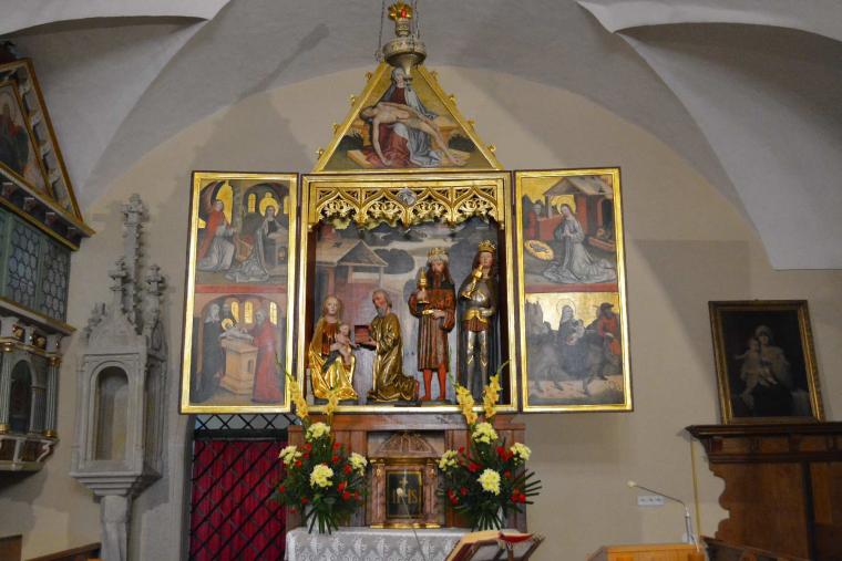 Po zamknięciu skrzydeł bocznych przed oczami modlących jawią się dwie postaci naturalnej wielkości namalowane na desce: Matka Boża Bolesna i Jezus ubiczowany. Zwieńczeniem górnej części ołtarza jest scena pasyjna – Maryja trzyma na rękach ciało umęczonego Syna (pieta). Na uwagę zasługuje też piękna ambona z wizerunkami ewangelistów.