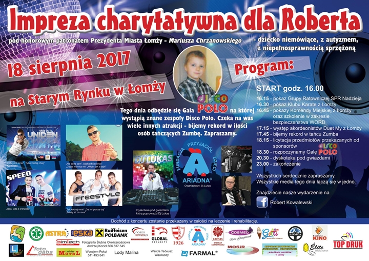 Na scenie wystąpią m.in. akordeoniści Duet My z Łomży, Majkel &Sequence, Freestyle, Speed, Uniden. W trakcie wydarzenia odbędą się również pokazy: Komendy Miejskiej Policji w Łomży i Grupy Ratowniczej SPR Nadzieja, a także szkolenie w zakresie bezpieczeństwa,bicie rekordy przez osoby tańczące Zumbę czy liczne licytacje przedmiotów.Imprezę rozkręci Dj Lukas. Szczegółowy harmonogram na plakacie.