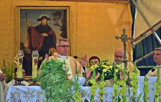 Uroczystej sumie odpustowej sprawowanej o godz. 11:00 przewodniczył ks. bp Senior Stanisław Napierała. Wcześniej bp Senior dokonał obrzędu błogosławieństwa zwierząt, który stanowi nierozłączny element uroczystości odpustowych ku czci św. Rocha w Mikstacie. Na początku Eucharystii ks. kan. Krzysztof Ordziniak, kustosz Diecezjalnego Sanktuarium Świętego Rocha w Mikstacie skierował słowa podziękowania za przybycie na uroczystości odpustowe do ks. Biskupa Stanisława Napierały. Wyraził radość z obecności ks. biskupa wśród nas. Ks. kustosz przywitał kapłanów, przedstawicieli władz, pielgrzymów, parafian. Poprosił następnie ks. Bpa, by sprawował tę sumę w intencji wszystkich pielgrzymujących na uroczystości odpustowe.