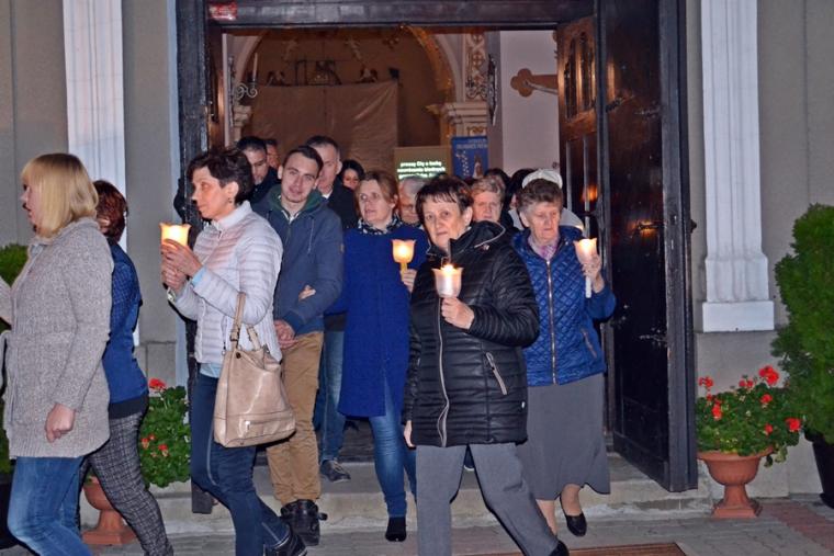Po zakończeniu modlitwy różańcowej za krzyżem i figurą Matki Boże Fatimskiej ze śpiewem na ustach, z płonącymi lampionami wyruszyliśmy w procesji wokół kościoła. Po powrocie procesji do kościoła w łączności duchowej z Jasną Górą zaśpiewaliśmy Apel Jasnogórski. Ku niebu popłynęły słowa: Maryjo: jestem, pamiętam, czuwam.