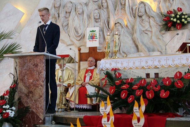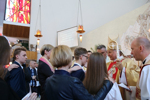 Zwracając się do młodzieży mającej przyjąć sakrament bierzmowania duchowny prosił ich, aby nigdy Chrystusa nie zdradzili i nie odeszli od Jego Kościoła. - Możemy korzystać z Bożego Miłosierdzia, a jeśli komuś brakowałby tego włożenia palca jak Tomaszowi, niech zaufa Panu Bogu z odwagą. Wątpić w Boga nie jest grzechem kiedy człowiek szuka, ale tkwić w grzechu to jest przeciw Panu Bogu. Niech to zesłanie Ducha Świętego umacnia was do odważnego dawania świadectwa miłości do Pana Boga i człowieka – mówił bp Janiak.