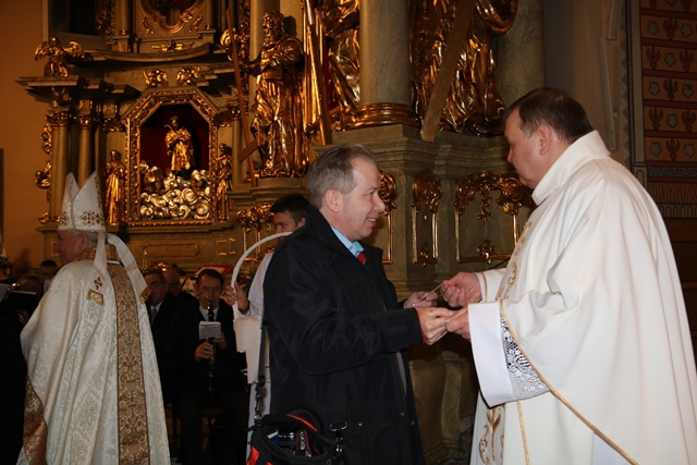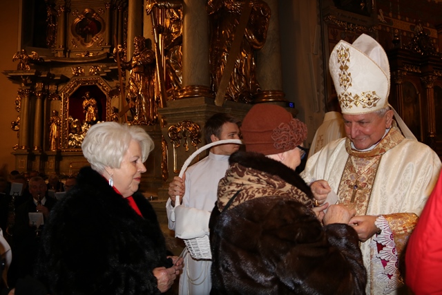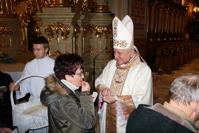 Po Mszy św. biskup i proboszcz przełamali się opłatkiem z wiernymi.