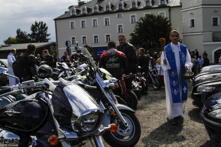 Mszę Świętą o godzinie 15:00 poprzedziła modlitwa – Koronka do Bożego Miłosierdzia prowadzona przez kleryków WSD w Tuchowie. Doświadczyliśmy też intensywnego, ale na szczęście przelotnego deszczu. W tym czasie przed ołtarzem zebrała się pielgrzymka rowerzystów, motocyklistów i kierowców. Głównym celebransem i kaznodzieją był ks. Grzegorz Grych. Rozpoczął on homilię od zwrócenia naszej uwagi na konieczność ruchu w życiu człowieka, ruchu, który jest związany nie tylko z podróżowaniem, ale z samym życiem. Za przykład dał nam Matkę Bożą, która „poszła z pośpiechem”. Maryja ten entuzjazm i werwę do swojego pośpiechu czerpała z natchnienia Ducha Świętego. Kaznodzieja przypomniał nam, że Maryja jest naszą przewodniczką, stale nam towarzyszącą, która prowadzi nas do Chrystusa. Ona też otwiera nasze serca na Ducha Świętego, dzięki któremu możemy prawdziwie się modlić, dobrze spowiadać, przyjmować sakramenty. Duch Święty pomaga nam zwalczać nasze grzechy i nałogi, pokonywać największe trudności naszego życia. To z Jego ręki mamy przyjmować wielorakie dary. Najdalszą i najwspanialszą podróżą naszego życia – mówił kaznodzieja – jest nasza podróż do wieczności, podróż do Boga. Ale to spotkanie z Bogiem jest możliwe już tu na ziemi, każdy kto obcuje z Jezusem w Eucharystii, ten przebywa w obecności Trójcy Świętej, w wieczności, w niebie. Ks. Grzegorz Grych przestrzegał nas też, abyśmy nie odrzucali tej podróży poprzez grzech, szczególnie przez grzech ciężki. Kończąc homilię zaprosił nas do tej najważniejszej podróży w Liturgii Eucharystycznej.