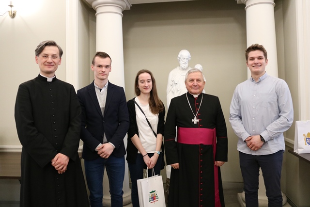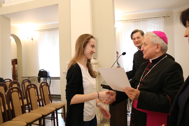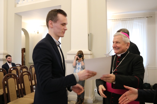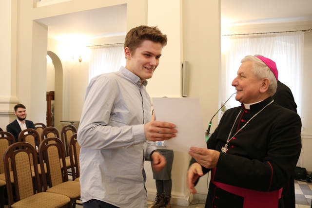 Biskup kaliski Edward Janiak gratulował laureatom etapu diecezjalnego Olimpiady Teologii Katolickiej, która odbyła się pod hasłem „Pokój i nadzieja dla Europy w nauczaniu Benedykta XVI i Franciszka”.