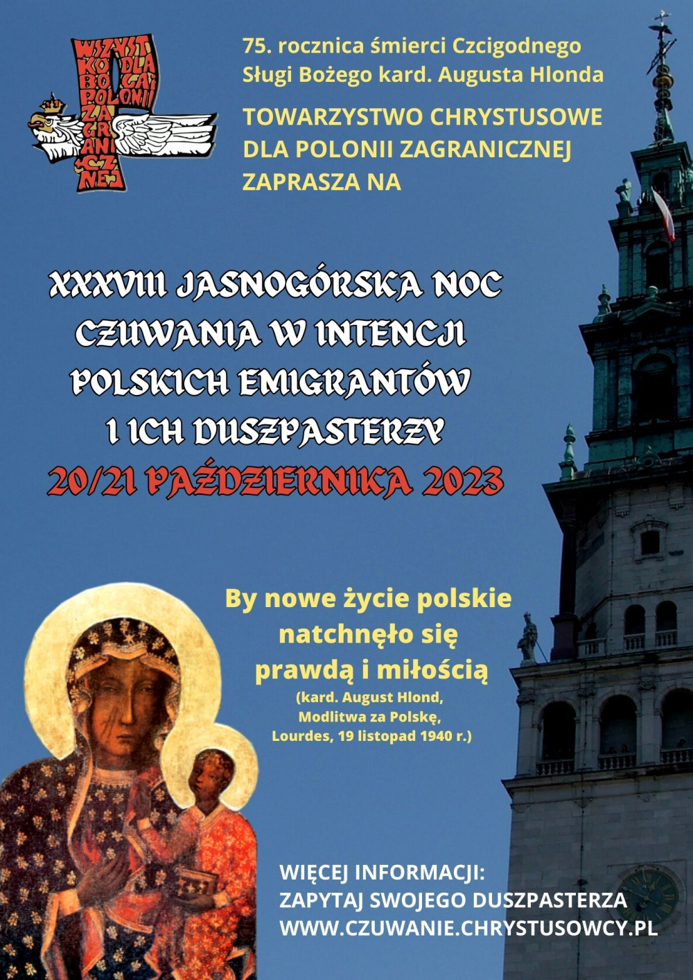 Doroczne Czuwanie Modlitewne w intencji Polonii i jej duszpasterzy odbędzie się z 20 na 21 październik br. w Narodowym Sanktuarium na Jasnej Górze. Zgromadzimy się by modlić się za całą Polonię świata oraz za tych, którzy sprawują nad nią duchową pieczę; "modlić się, by nowe życie polskie natchnęło się prawdą i miłością". Te słowa Czcigodnego Sługi Bożego kard. Augusta Hlonda, będą przyświecać modlitwie w przededniu 75. rocznicy jego śmierci.