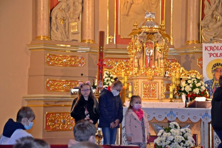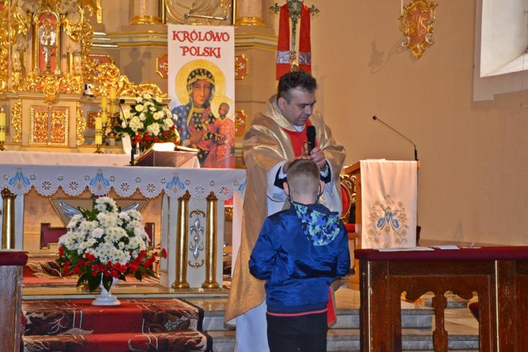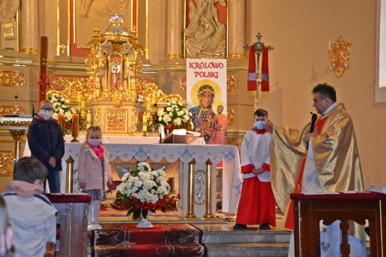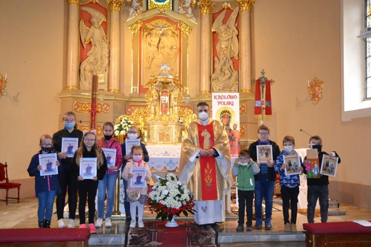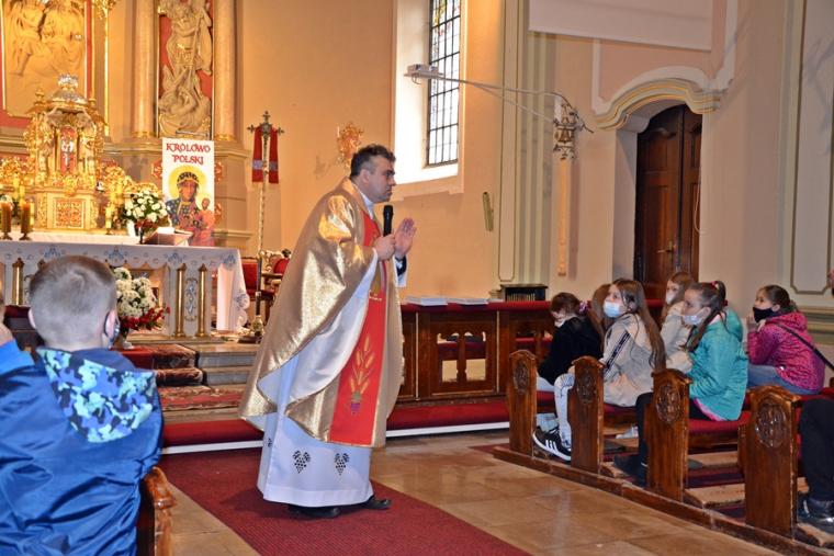 Do tej pory Rochowe Szesnastki odbywały się on-line.  16. maja udało nam się spotkać w naszym parafialnym kościele. Majowa Rochowa Szesnastka połączona została z Eucharystią. Odbyło się podczas niej także podsumowanie zadań, które mieli do wykonania uczestnicy spotkań w ostatnich miesiącach. Eucharystii przewodniczył ks. kan. Krzysztof Ordziniak, kustosz Diecezjalnego Sanktuarium św. Rocha.  Na początku homilii opowiedział dzieciom o chłopcu, który pisał testament i jego siostrze. Rafał, bo tak miał na imię chłopiec, wszystko co dobre chciał zostawić sobie, to z czego nie był dumny ( oceny z matematyki) chciał zapisać w testamencie swojej siostrze. Opowiadanie to stało się punktem wyjścia do rozmowy z dziećmi o tym, czym jest testament i co można w nim pozostawić. Ks. kan. Krzysztof  nawiązał do obchodzonej uroczystości wniebowstąpienia. Podkreślił, że Pan Jezus przed wstąpieniem do nieba polecił apostołom, by szli i nauczali, głosili dobrą nowinę. Jednocześnie zaakcentował, że wobec każdego ochrzczonego Bóg ma plan. Miał i wobec naszego patrona św. Rocha, którego życie poznajemy. Przypomniał zebranym kilka ważnych momentów z życia św. Rocha. Zaznaczył, że podczas choroby Rochowi chleb przynosił pies. Wykorzystał ten moment, by zapytać dzieci, co się dzieje w Mikstacie podczas uroczystości odpustowych. Bez problemu uzyskał  od uczestników Rochowych  Szesnastek  odpowiedź, że święci ( błogosławi się zwierzęta). Wyjaśnił dzieciom, że obrzęd ten odbywa się w Mikstacie od ponad trzystu lat. Dodał, że tradycje odpustowe, zwyczaje zostały nam przekazane  przez naszych przodków, należy  je poznawać, dbać o to, by przekazać je kolejnym pokoleniom. Podczas jednego ze spotkań, kiedy omawialiśmy zagadnienia związane z  tradycjami  odpustowymi, jeden z chłopców  napisał, że są one naszym dziedzictwem, skarbem, o który powinniśmy, jako dziedzice się troszczyć. Ksiądz kustosz podkreślił, jak ważną rolę mają w tym zakresie do odegrania właśnie dzieci. Zaznaczył, że w poznawaniu tradycji odpustowych, postaci św. Rocha pomagać im mają Rochowe Szesnastki. Zachęcał dzieci do przyłączenia się do naszej grupy, bo sporo się w niej dzieje.