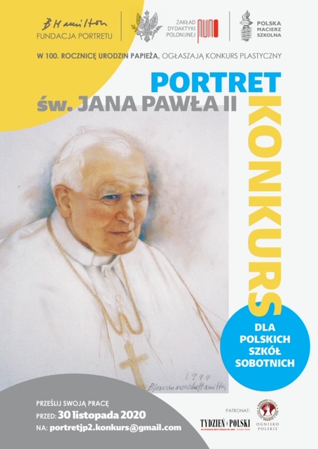 Wykonaj, przy użyciu dowolnej techniki, portret polskiego papieża!Wykonaną przez siebie pracę prześlij na adres e-mail: portretjp2.konkurs@gmail.com do dnia 30 listopada 2020.