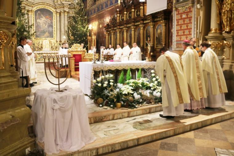 Wraz z biskupem Mszę św. koncelebrowali: ks. prał. dr Andrzej Latoń, wikariusz generalny diecezji kaliskiej, ks. prał. Adam Modliński, proboszcz katedry, ks. dr Piotr Górski, rektor Wyższego Seminarium Duchownego w Kaliszu, ks. Łukasz Pondel i ks. Marcin Załężny, ojcowie duchowni seminarium, ks. kan. Eugeniusz Synowiec, dyrektor administracyjny seminarium i ks. Rafał Kopis, ekonom diecezjalny. W modlitwę włączyli się także alumni, wspólnota neokatechumenalna, schola seminaryjna i wierni.