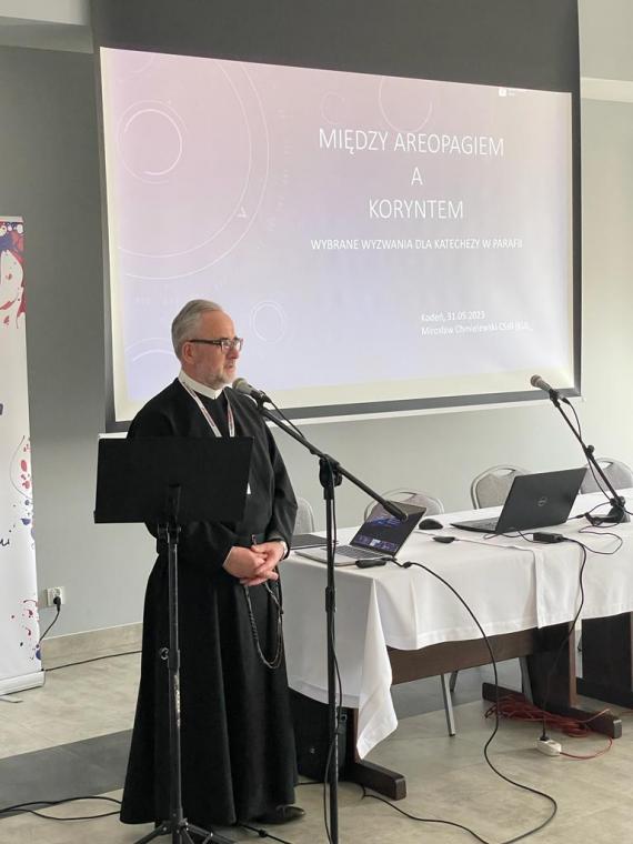 W pierwszym referacie zatytułowanym „Między Areopagiem a Koryntem” o. Mirosław Chmielewski przedstawił efekty swoich badań naukowych dotyczące katechezy w parafii. Prelegent podkreślił potrzebę właściwego odczytania rzeczywistości, w której się znajdujemy. Posługując się obrazem Aten i Koryntu ukazał, jak trudnym zadaniem jest głoszenie Ewangelii. W Atenach święty Paweł podejmuje się głoszenia Dobrej Nowiny o Jezusie. Ta próba głoszenia, mimo wielkiej erudycji i talentu mówiącego, kończy się fiaskiem. Zdaniem o. Mirosława w tej sytuacji można poszukiwać pewnych analogii do współczesnej sytuacji nauczania lekcji religii w szkole w Polsce. Prelegent podkreślał potrzebę właściwego odczytania adresata i kontekstu współczesnego przepowiadania.