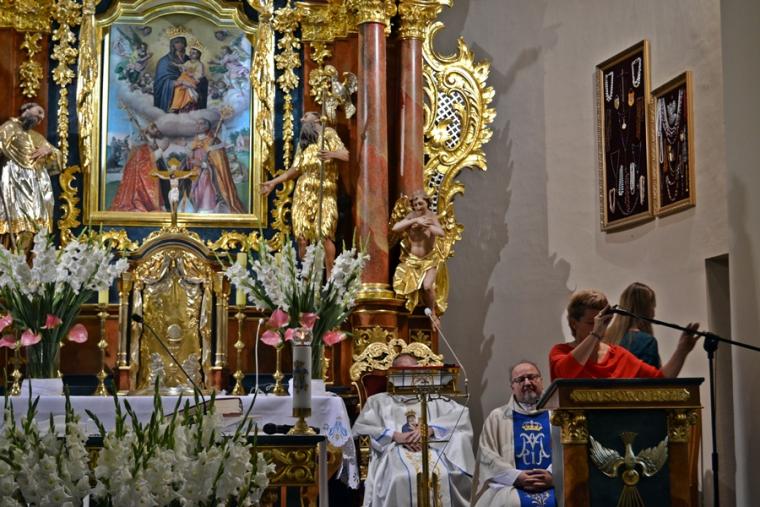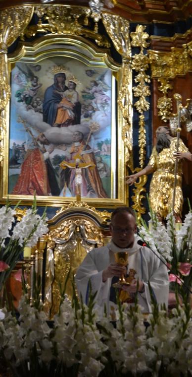 Ks. Piotr zachęcał zebranych, by postawili sobie pytanie o to co uczyniliśmy ze swoim chrztem, bo jak dodał jest to pytanie o naszą postawę życiową. Kończąc kaznodzieja powiedział: „My dzisiaj tutaj obecni patrzący na oblicze naszej Pani Kotłowskiej w Jej szczególnym cudownym wizerunku wołamy z wielką mocą Duchu Święty przyjdź napełnij nas swoją mocą. Uczyń nas Jej świadkami . Com przyrzekł Bogu przy chrzcie raz... Amen” .
