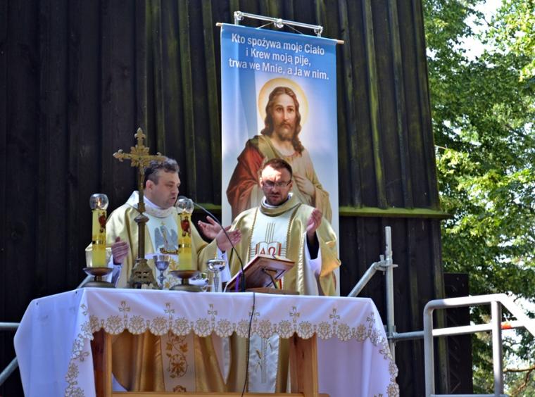 31. maja obchodziliśmy Uroczystość Najświętszego Ciała i Krwi Pańskiej. Jest to dzień wyjątkowy w życiu Kościoła, ale także w życiu każdej wspólnoty parafialnej. . W tym szczególnym dniu Jezus ukryty pod postacią chleba w Najświętszym Sakramencie opuszcza kościół, by przemierzając ulice miast, miasteczek, wiosek zobaczyć, jak się powodzi Jego dzieciom. W mikstackiej wspólnocie parafialnej uroczysta suma, po której ulicami miasta wyruszyła procesja do czterech ołtarzy została odprawiona przy Diecezjalnym Sanktuarium Świętego Rocha o godz. 9:00. Przewodniczył jej ks. kan. Krzysztof Ordziniak, kustosz sanktuarium, współcelebransem był ks. wikariusz Krzysztof Lipiński. Ksiądz proboszcz polecał w Eucharystii wszystkich parafian, tych którzy przygotowywali ołtarze oraz tych, którzy będą obsługiwali procesje. Homilię wygłosił ks. kan. Krzysztof Ordziniak. Rozpoczynając podkreślił, że dwa razy w ciągu roku Bóg opuszcza mury kościoła, by udać się do swoich dzieci. Czyni to w uroczystość Wszystkich Świętych, kiedy to idzie na cmentarze, by opłakiwać wraz z nami naszych bliskich, przyjaciół, znajomych. To drugie wyjście ma charakter radosny i ma miejsce właśnie w uroczystość Najświętszego Ciała i Krwi Pańskiej. W tym dniu- jak podkreślił celebrans przygotowujemy ołtarze, dekorujemy domy, aby przywitać Pana, nawiedzającego zagrody swoich dzieci. Kontynuując ks. kan. przywołał słowa pieśni „ Zróbcie Mu miejsce, Pan idzie z nieba…” zaakcentował, że wskazuje ona z jednej strony cel wyjścia Jezusa ze świątyni, ale także sposób w jaki powinniśmy czcić przyjście Pana. Kaznodzieja wskazał, że pieśń ta wskazuje dary jakie przynosi nam Pan. Zaznaczył, że udział w procesji jest wyznaniem naszej wiary. Przytoczył wydarzenie z czasów okupacji, kiedy to grupa więźniów udała się z obozu pracy do miasteczka eskortowana przez esesmanów. Po drodze spotkali kapłana jadącego z Wiatykiem do chorego. Wszyscy uklękli. Ów kapłan, jak wskazał celebrans, będąc pod wrażeniem takiej relacji więźniów zapisał w kronice mi. in. takie słowa: „Naród, który ma taką wiarę, nie może zginąć”. Ks. kan. Krzysztof zachęcał zebranych, by zapamiętali te słowa, ale także by czcili Chrystusa nie tylko pokłonem, ale także śpiewem. Podkreślił, że procesja nie jest pochodem niemych, a polskie pieśni eucharystyczne są niezwykle piękne. Przywołał przykład barwnych procesji Bożego Ciała odbywających się w Łowiczu, które zostały wpisane na Krajową Listę Niematerialnego Dziedzictwa Kulturowego, na której jak przypomniał ks. kustosz znajdują się także nasze uroczystości odpustowe ku czci św. Rocha połączone z obrzędem błogosławieństwa zwierząt.