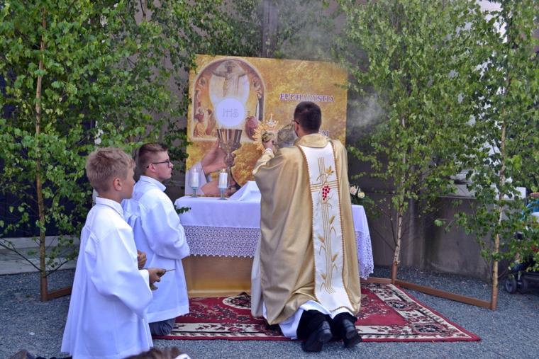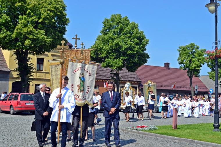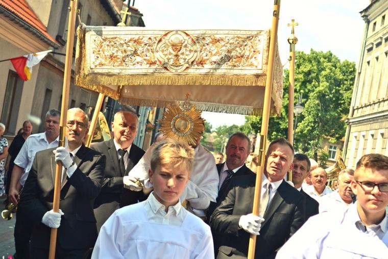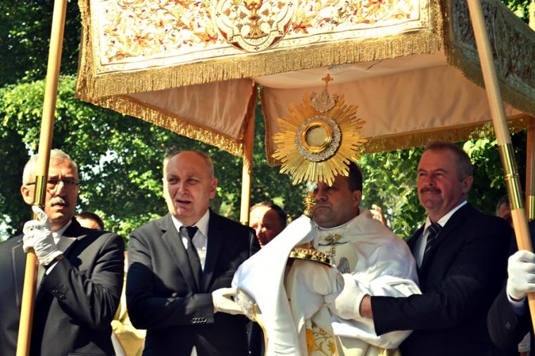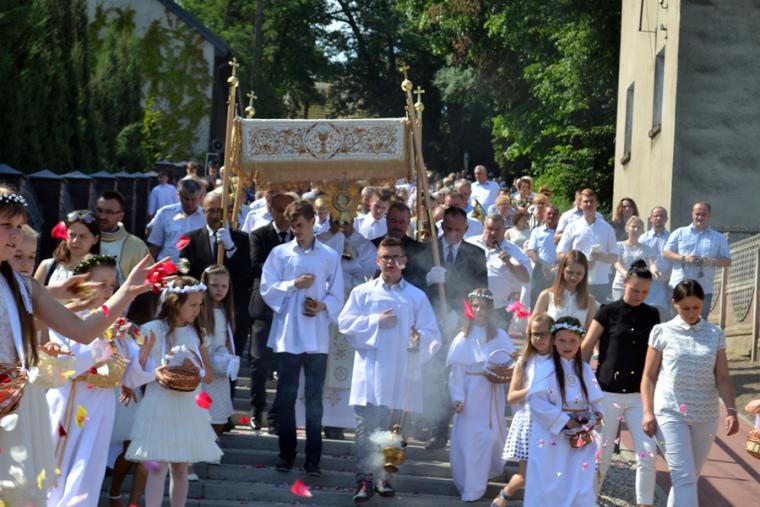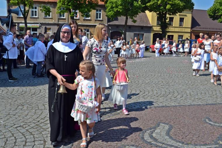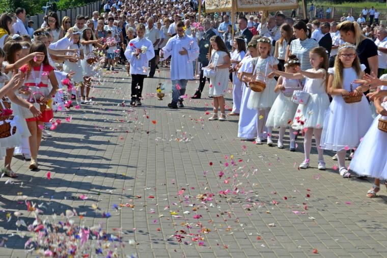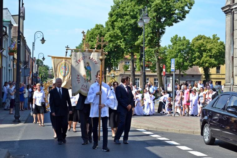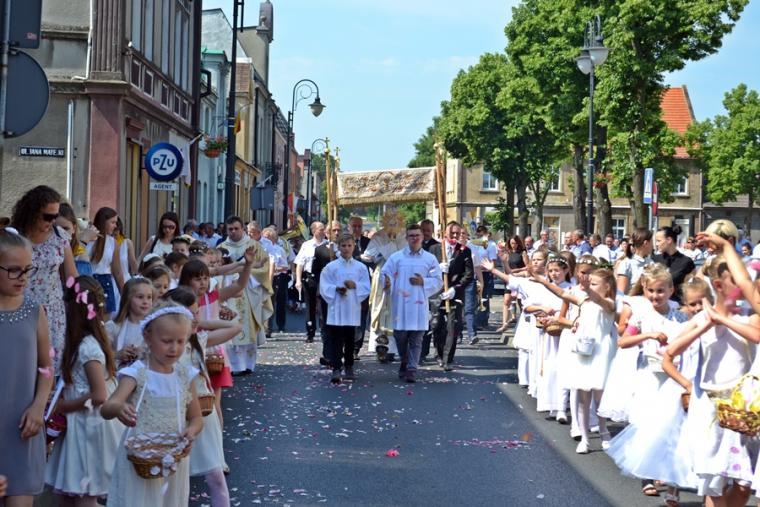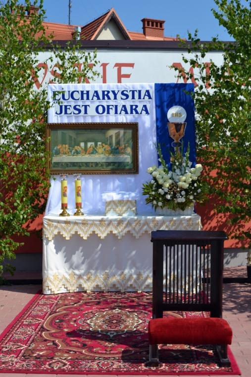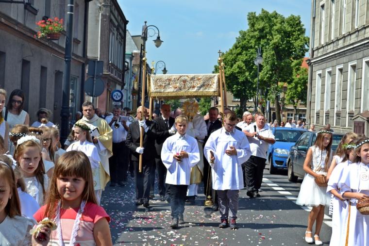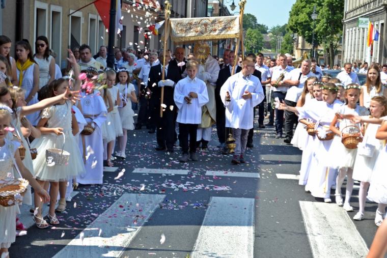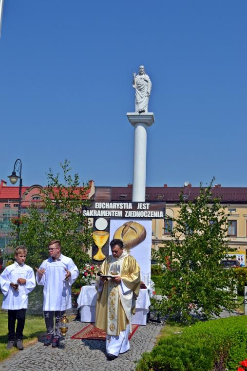 Wracając do głównego wątku rozważania kaznodzieja zachęcał wiernych do postawienia sobie pytania: „Co Jezus ukryty pod postacią Chleba, zobaczy w czasie wędrowania przez nasze miasto i parafię? Jaką zobaczy Ojczyznę, jaki Kościół, jaką rodzinę, jakiego człowieka?”. W dalszej części homilii celebrans podkreślił, że uroczystość Bożego Ciała jest wielkim pokłonem złożonym Jezusowi, ale jednocześnie zachęcał, by odpowiedzieć sobie na pytanie, czy zawsze oddajemy Bogu pokłon. Zaznaczył, że różnie z tym bywa. Myślą przewodnią rozważania były słowa pieśni „ Zróbcie Mu miejsce…”. Kończąc rozważanie ks. kanonik powiedział: „ Mam do Was ogromną prośbę w tym roku, abyśmy zrobili Bogu miejsce w naszych kalendarzach, które są tak mocno zapełnione różnymi sprawami”. Parafia podzielona jest na rejony, jak podkreślił ks. proboszcz nie tylko po to, by wywiązywały się one m.in. z organizacji procesji w poszczególnych dniach, ale i po to, by ich mieszkańcy w tych dniach uczestniczyli w Eucharystii. Jak odpowiemy na to zaproszenie? Czy zrobimy miejsce dla Pana w naszych sercach i w naszych kalendarzach. Tak wielu z nas przyjęło Jezusa w Komunii Świętej. Zrobiliśmy Mu miejsce w naszych sercach. Po Mszy Świętej odbyło się wystawienie Najświętszego Sakramentu, następnie wraz z Jezusem ukrytym pod postacią Chleba wyruszyliśmy w procesji do czterech ołtarzy. Przedstawiciele poszczególnych regionów przygotowali ołtarze. Trasa tegorocznej procesji wiodła od Diecezjalnego Sanktuarium Świętego Rocha do krzyża misyjnego przy naszej farze, której 100- lecie konsekracji przeżywać będziemy w październiku. Jak to już staje się tradycją w naszej wspólnocie co roku procesja odbywa się inna trasą, bo Jezus przychodzi do wszystkich. Przy poszczególnych ołtarzach wsłuchiwaliśmy się w rozważania, których myślą przewodnia była EUCHARYSTIA. Na pierwszym ołtarzu znajdowało się hasło: Eucharystia jest Ofiarą. W słowach rozważania usłyszeliśmy m.in. „ W opisie Eucharystii bardzo ważne są cztery czasowniki: brać, błogosławić, łamać, dawać. Dzięki nim możemy zaobserwować, na czym polega logika ofiary Jezusa”. O tym jak wielka jest tajemnica Boga i o Eucharystii jako pokarmie dla duszy mowa była w rozważaniu przy drugim ołtarzu. Na trzecim ołtarzu widniało hasło: „Eucharystia jest sakramentem zjednoczenia”. Tu do wiernych popłynęło przesłanie: „ Ten, który pokonał śmierć może wejść pomimo drzwi zamkniętych, pomimo zakrytych bielmem oczu i zatwardziałych serc. Wówczas, gdy On wychodzi nam naprzeciw , ukazuje się jako żyjący, dający życie”. Hasło na trzecim ołtarzu zachęcało nas do spojrzenia na Eucharystię jako zadatek nieśmiertelności. Tu wybrzmiało także Te Deum laudamus. Procesję zakończyło błogosławieństwo Najświętszym Sakramentem na cztery strony świata. Podczas procesji niesione były sztandary i feretrony. Uroczystość uświetniła orkiestr parafialna i chór. A tuż przed baldachimem kroczyły dziewczęta sypiące kwiatki. Było ich podczas tegorocznej procesji bardzo dużo. Jezus ukryty pod postacią Chleba przemierzał ulice naszego miasteczka obsypywany płatkami kwiatków.