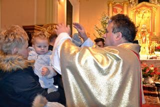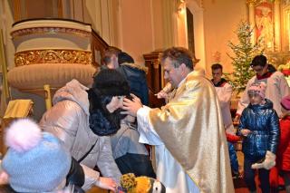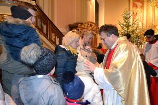 O nietypowej godzinie, bo o 0.15  sprawowana była Eucharystia  w mikstackim wieczerniku  1. stycznia,  ale i dzień wyjątkowy- pierwszy dzień Nowego- 2019- Roku.  Część parafian postanowiła przywitać go właśnie udziałem we mszy świętej, by z Bożym błogosławieństwem pod opieką Maryi Bożej Rodzicielki rozpocząć kolejny rok. Mszę świętą  w intencji parafian sprawował ks. kan. Krzysztof Ordziniak. Składając życzenia zebranym  w kościele przywołał fragment z  Księgi  liczb:  „Niech cię Pan błogosławi i strzeże. Niech Pan rozpromieni oblicze swe nad tobą, niech cię obdarzy swą łaską.  Niech zwróci ku tobie oblicze swoje i niech cię obdarzy pokojem. Tak będą wzywać imienia mojego nad Izraelitami, a Ja im będę błogosławił”. Potrzebujemy błogosławieństwa i opieki  Bożej w każdym dniu rozpoczynającego  się Nowego Roku. Potrzebujemy umocnienia, ale i nadziei, by z wiarą przyjąć wszystko co na nadchodzące dni przygotował dla nas Bóg. W tej mszy świętej uczestniczyli przede wszystkim dorośli. Stało się już tradycją w mikstackiej wspólnocie, że w pierwszym dniu Nowego Roku sprawowana jest msza święta w intencji dzieci połączona z indywidualnym błogosławieństwem. Mimo niesprzyjających warunków atmosferycznych także 1. stycznia A.D. 2019 roku na godzinę 16:00 licznie przybyli do mikstackiej fary rodzice ze swoimi dziećmi. Przynieśli, przyprowadzili, bądź przywieźli swoje dzieci do świątyni, by i one z Bożym błogosławieństwem wkroczyły w Nowy Rok. Mszę świętą sprawował ks. proboszcz Krzysztof Ordziniak. Podczas dialogowanej homilii udał się z dziećmi do żłóbka. Motywem przewodnim rozmowy była brama. Najpierw ks. kanonik zwrócił uwagę młodym parafianom, że wchodząc do kościoła przekroczyli bramę nad którą widnieje napis: „ Zaiste dom to Boży i brama niebieska”. Przy żłóbku ks. kan. Krzysztof nawiązał do słów Ewangelii i nadania imienia Jezusowi. Następnie dzieci wraz z kapłanem podeszły do chrzcielnicy. Tu podkreślono, że chrzest jest bramą, dzięki  której stajemy się dziećmi Bożymi. Kolejnymi ważnymi bramami, istotnymi w życiu człowieka wierzącego, na które zwrócił uwagę kaznodzieja są: sakrament pokuty, pełne uczestnictwo we mszy świętej, a także sakrament bierzmowania. Kapłan zwrócił uwagę na bramę, którą przekraczamy odprowadzając naszych bliskich zmarłych na miejsce wiecznego spoczynku.  Rozważania dotyczące przekraczania poszczególnych bram stały się okazją do podania danych statystycznych dotyczących życia parafii. Tym razem to tu, przy chrzcielnicy zostało złożone wyznanie wiary.  Po Mszy Świętej ks. proboszcz Krzysztof  Ordziniak  odmówił modlitwę błogosławieństwa dzieci. Następnie ks. proboszcz i ks. wikariusz udzielali dzieciom indywidualnego błogosławieństwa. Dzieci  otrzymały  pamiątkowe obrazki z Aniołem Stróżem i słodycze. Wielu rodziców wraz ze swoimi dziećmi zatrzymywało się przy żłóbku  na chwil modlitwy. Zapewne, wiele rodzin zaprosiło  do swego życia Jezusa, Maryję i Józefa. Pod taką opieką dzieci będą wzrastały w łasce i mądrości u Boga i ludzi... Będą radością  nie tylko dla rodziców, ale i wspólnoty parafialnej. Dodajmy, że wystrój żłóbka nawiązuje do obchodzonego w 2018 roku jubileuszu 100-lecia konsekracji kościoła farnego.
